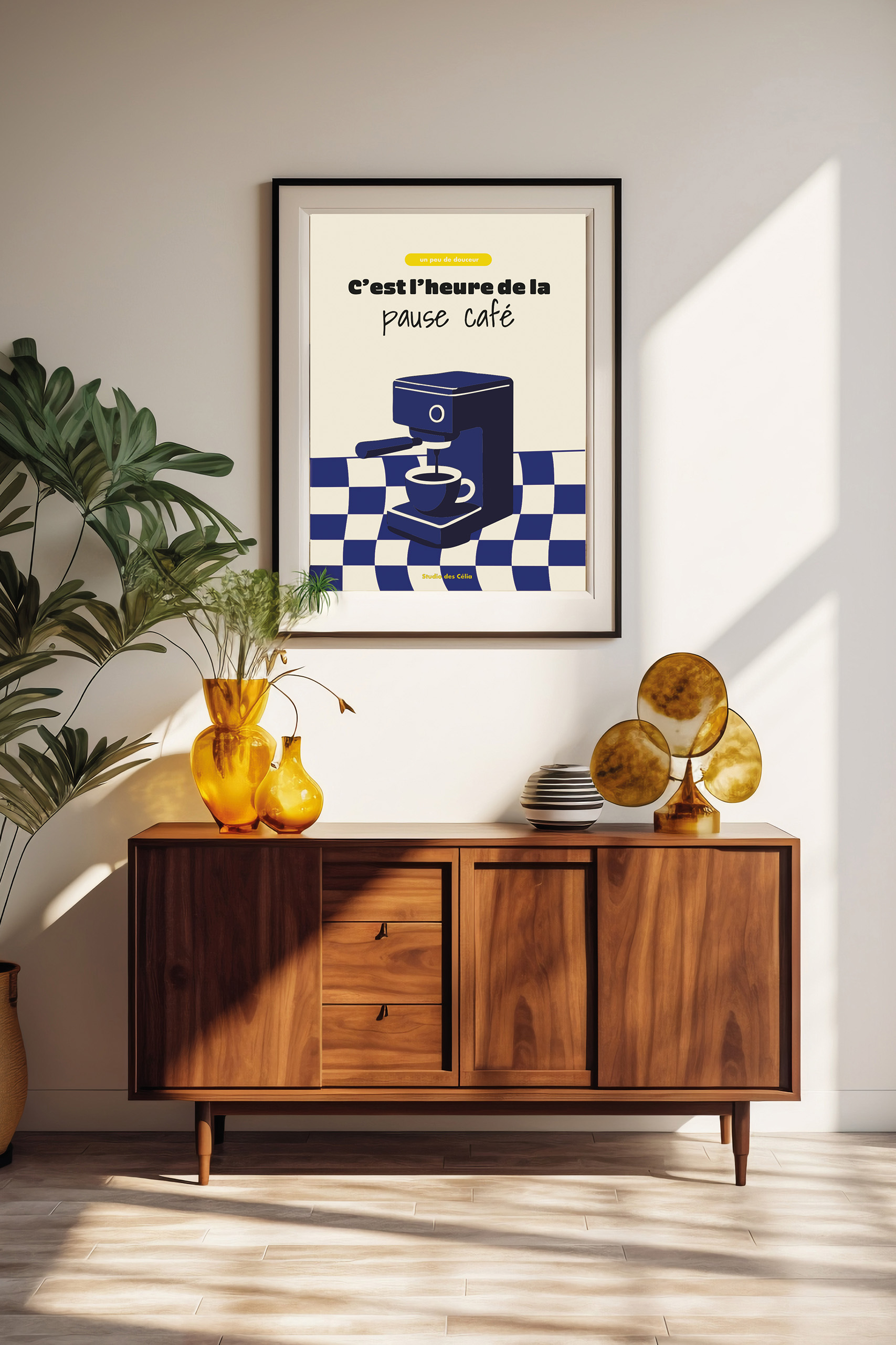 Plongez dans un moment de douceur avec cette affiche illustrée autour de l’incontournable pause café. Son style graphique épuré, ses contrastes bleu profond et crème, et sa composition rétro-moderne en font une pièce décorative parfaite pour une cuisine, un coin bureau ou un espace détente.